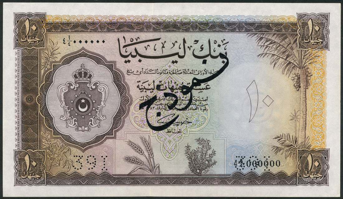 Bank of Libya, specimen 10 pounds, 1962, serial number 4 A/4 000000, brown on multicolour underprint, arms at left, value at right and each corner, reverse brown, Khalil Al Bennani signature, black SPECIMEN overprint in Arabic, perforated