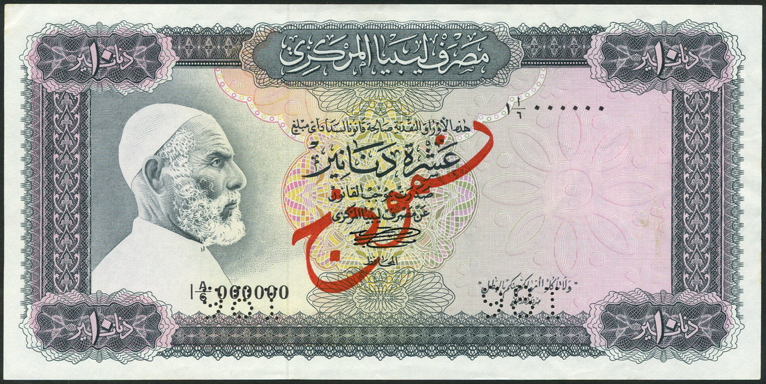 Central Bank of Libya, a specimen set of the ND (1972), series1, comprising 1/4 dinar, orange-brown, 1/2 dinar, purple, both arms at left, 1 dinar, turquoise, minaret at left and 5 dinars, olive, arms at left, 10 dinars, blue-grey, Omar El Mukhtar at left, Saherlala signature, all with red Arabic overprint and perforated