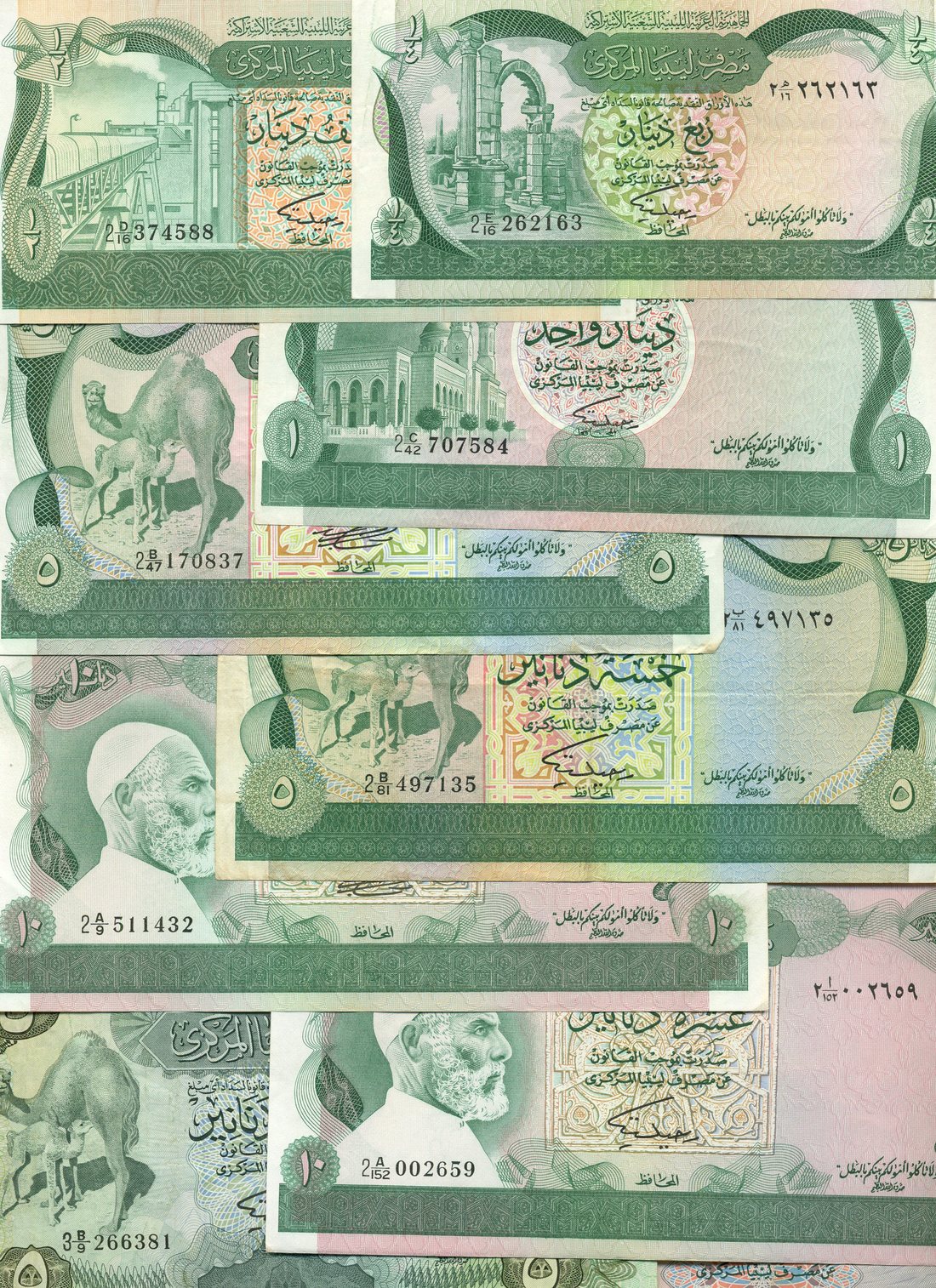 Central Bank of Libya, Socialist People's Republic, a group comprising 1/4, 1/2, 1, 5 (2) and 10 dinars (2) from the 1980-1981 issue, 5 and 10 dinars, 1984, 1/4, 1, 5 (3), 10 dinars (8), from the 1991-3 issue, 1 dinars (5), 2002, serial number 433763-7, 5 dinars 2002, 50 dinars, 2008,