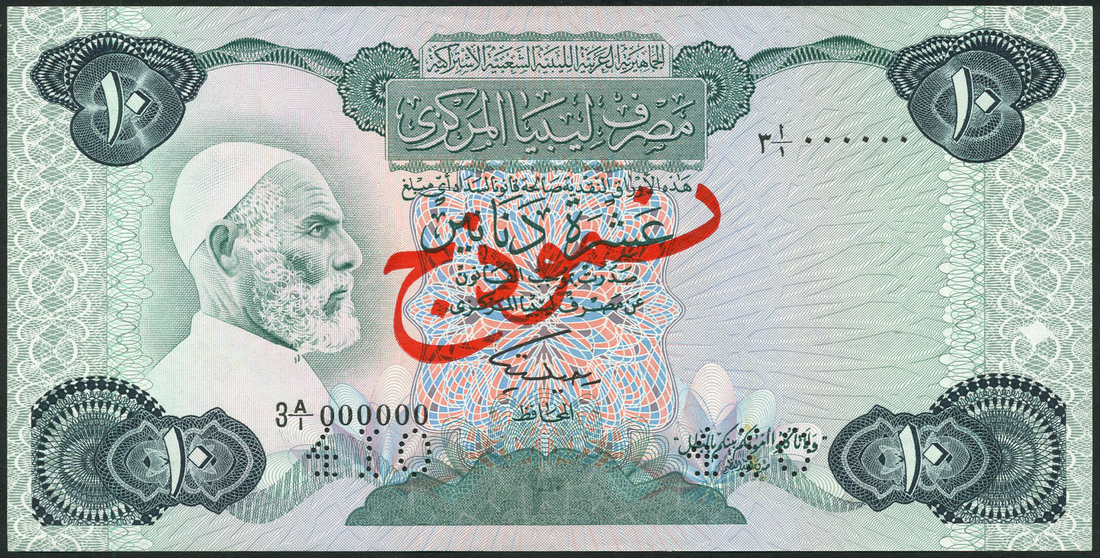 Central Bank of Libya, Socialist People's Republic, a specimen set from the 1984 issue comprising 1/4 dinar, prefix 3 E/1, 1 dinar, prefix 3 C/1, 5 dinars, prefix 3 B/1 and 10 dinars, prefix 3 A/1, all with red Arabic specimen overprint, perforated
