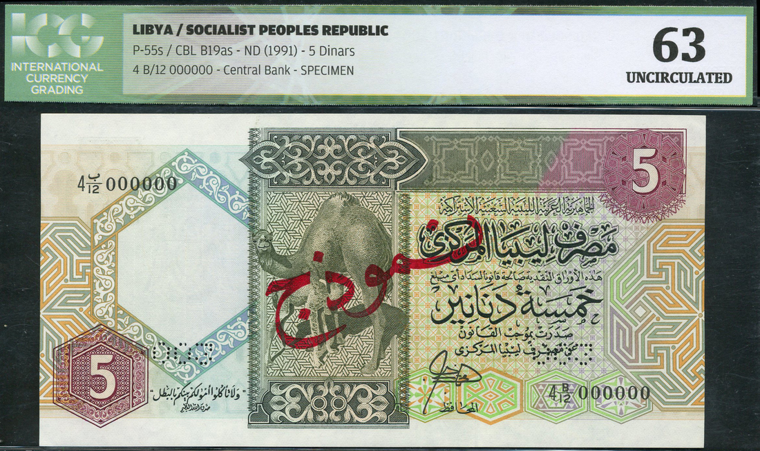 (x) Central Bank of Libya, Socialist People's Republic, specimen 1/4 dinar, ND 91990), serial number 4E/1 000000, multicolour, arch of Trajan at centre, specimen 5 dinars, ND (1990), serial number 4B/12 000000, multicolour, camel at centre, both with red SPECIMEN overprint in Arabic