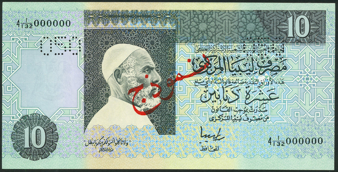 Central Bank of Libya, Socialist People's Republic, a set from 1991-1993 issue comprising, 1/4, 1/2, 1, 5 and 10 dinars, the 5 dinars with Abdulhafid Mahmoud Zilitni signature, the remainder Taher E. Jihimi signature, all with zero serial number, red specimen overprint, perforated
