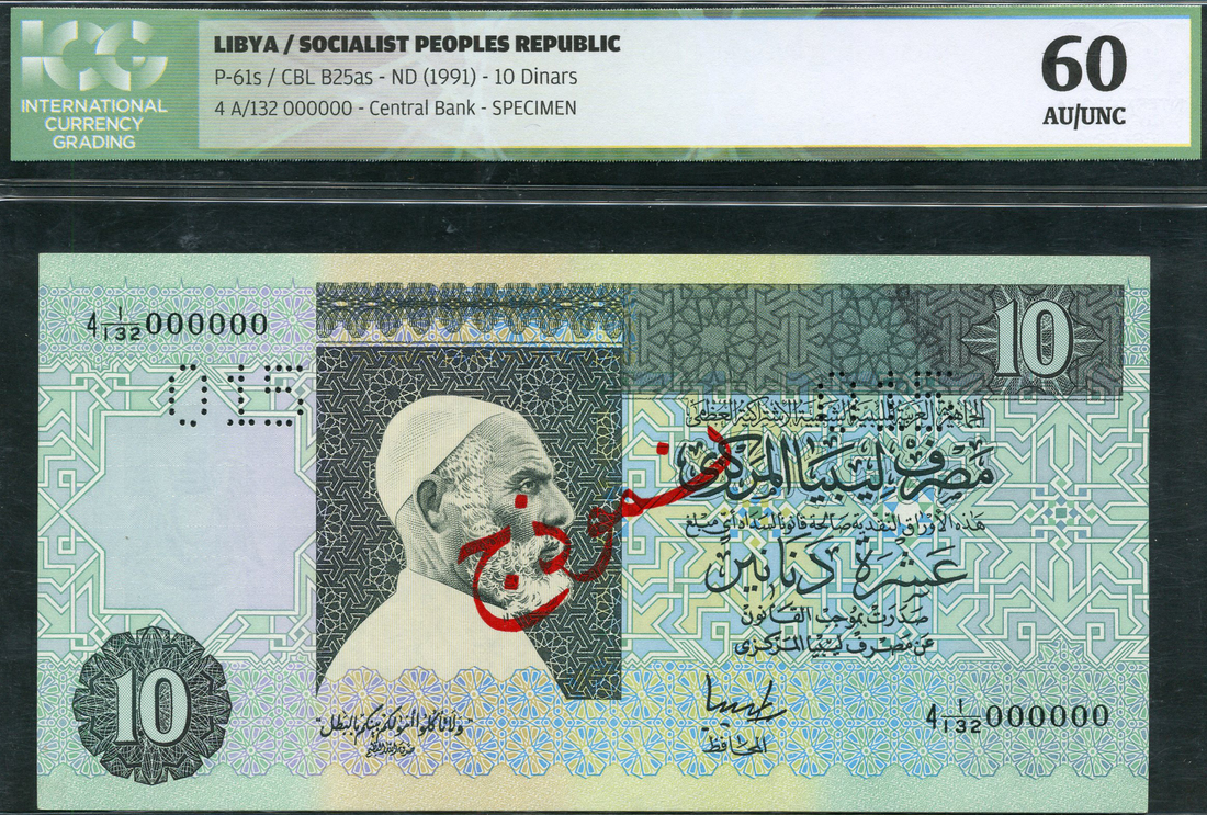 (x) Central Bank of Libya, Socialist People's Republic, a partial specimen set from the 1991 issue comprising 1/2 dinar, Jihimi signature, 1 dinar, M. Zilitni signature and 10 dinars, Jihimi signature, all with red SPECIMEN overprint in Arabic