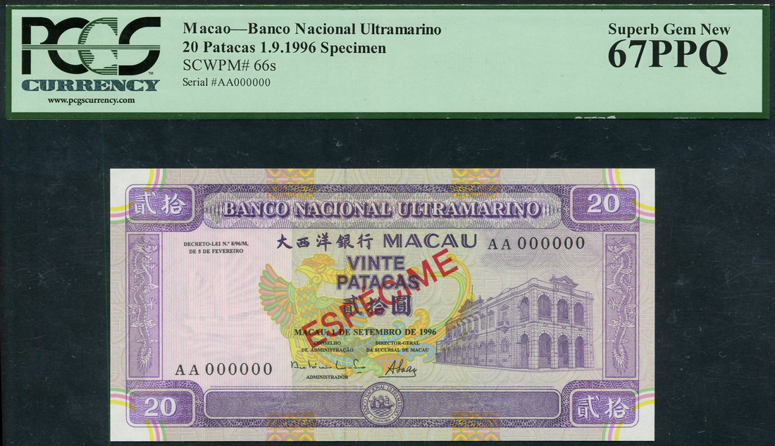 (x) Banco Nacional Ultramarino, Macau, specimen 20 patacas, 1 September 1996, serial number AA 000000, purple on multicolour, bank building at right