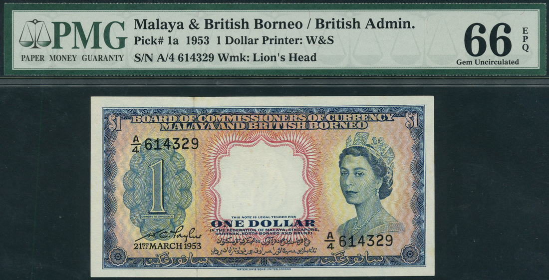 Board of Commissioners of Currency Malaya and British Borneo, $1, 21 March 1953, serial number A/4 614329, dark blue on multicolour underprint, portrait Queen Elizabeth II at right, value in ornate tablet at left, bank title top centre, reverse, coats of arms within blue guilloche pattern