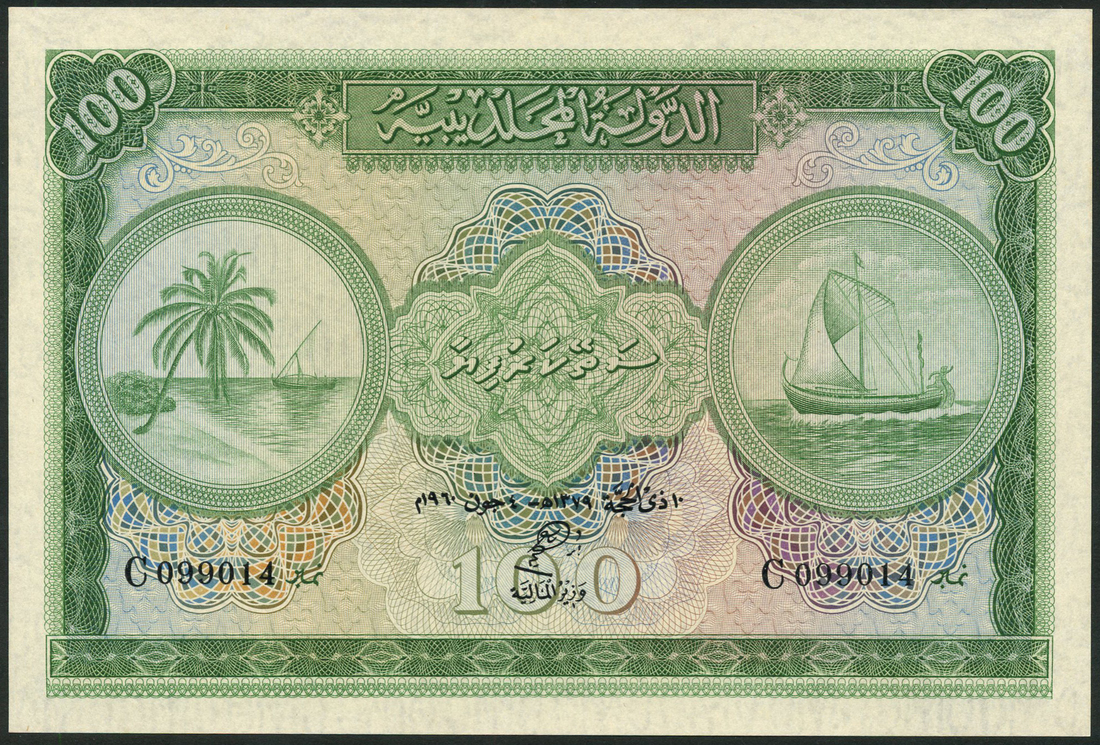 Government of Maldives, a set from the 1960 issue, comprising 1 rufiyaa, serial number C839057, 2 rufiyaa, serial number C409425, 5 rufiyaa, serial number C740226, 10 rufiyaa, serial number B042935, 50 rufiyaa, serial number C097869, 100 rufiyaa, serial number C099014, all with palm trees at left, dhow at right
