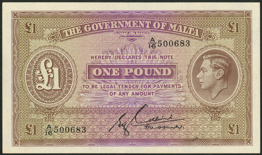 (x) Government of Malta, £1 (2), ND, serial numbers A/16 500683 and A/16 783212, brown and violet, 10 shillings (2), ND (1940), serial numbers A/3 715070 and A/3 715101, blue and brown on multicolour, all with portrait King George VI at right, value in ornate frame at left and in each corner and in tablet at centre