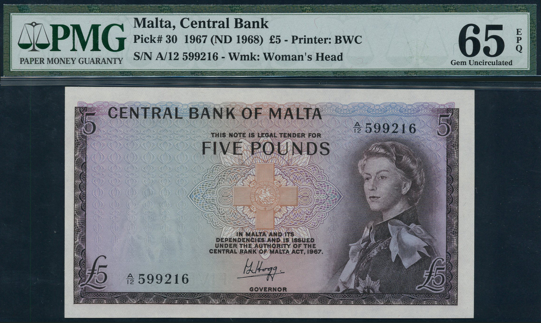 Central Bank of Malta, £5, ND (1968), serial number A/12 599216, dark brown on multicolour underprint, portrait Queen Elizabeth II at right, George Cross at centre, value in each corner and top centre, reverse, Grand Harbour