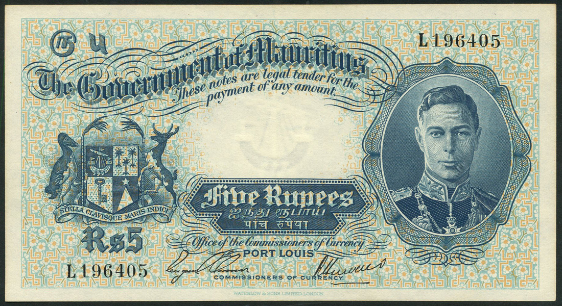 (x) Government of Mauritius, 5 rupees, ND (1937), serial number L196405, blue on multicolour underprint, portrait King George VI at right, arms at left
