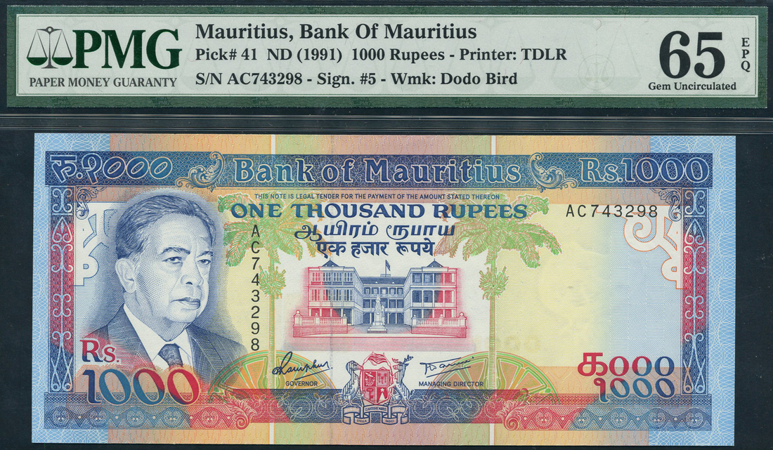Bank of Mauritius, 1000 rupees, ND (1991), serial number AC 743298, blue on multicolour, portrait First President Veerasamy Ringadoo at left, Government House at centre, arms low centre, reverse, Port Louis Harbour,