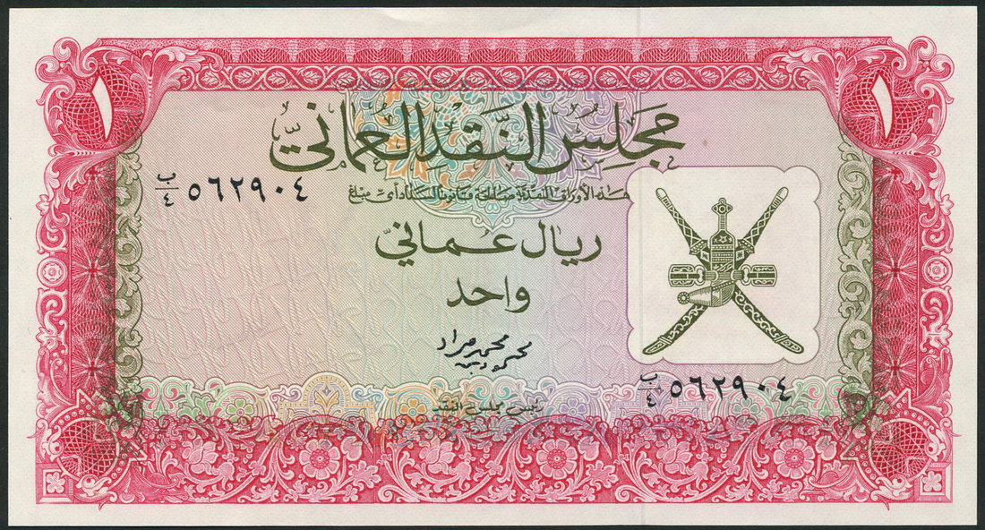 Oman Currency Board, 100 baiza, 1/4 rial Omani, 1/2 rial Omani and 1 rial Omani, ND (1972), brown, blue, green and red on multicolour respectively, all feature arms at right, value top left and right, ornate border