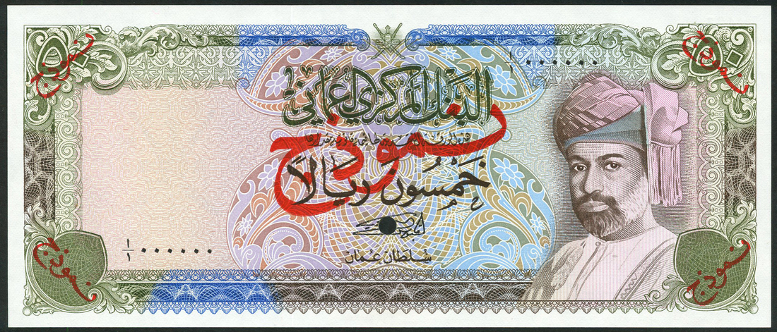 (x) Central Bank of Oman, specimen 50 rials, ND (1977), zero serial numbers, olive green and multicoloured, Sultan Qaboos bin Sa'id at right, arms at right, reverse olive green, brown, Jabreen fortress left centre