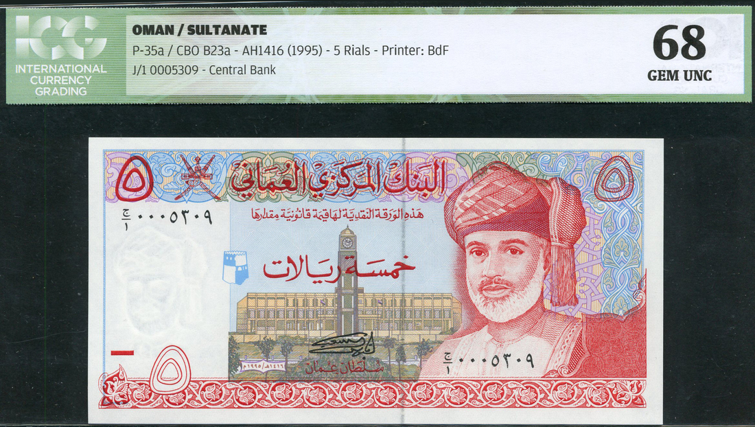 (x) Central Bank of Oman, 5 rials (2), 1995, consecutive serial numbers L/1 0005309-10, red on multicolour underprint, Sultan Qaboos bin Sa'id at right, university building and clock tower at centre, arms top centre left, reverse, Nizwa city view