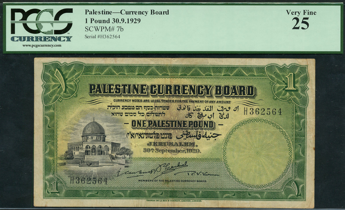 (x) Palestine Currency Board, £1, 30 September 1929, serial number H362564, black on green and yellow, Dome of the Rock at left, reverse green, Tower of David at centre