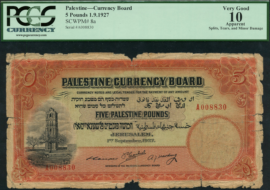 (TBB B103a, Pick 8a), in PCGS holder number 10, very good, few examples believed extant and a key note for the series and missing in most collections of Palestine currency