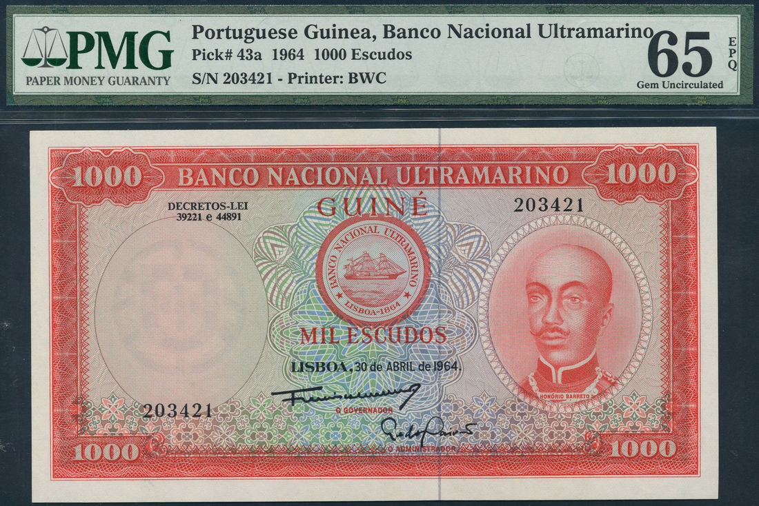 Banco Nacional Ultramarino, Portuguese Guinea, 1000 escudos, 1964, serial number 203421, red on multicolour, portrait Honorio Barreto at left, ship seal at centre, value in each corner and at centre, reverse, woman looking out at boats