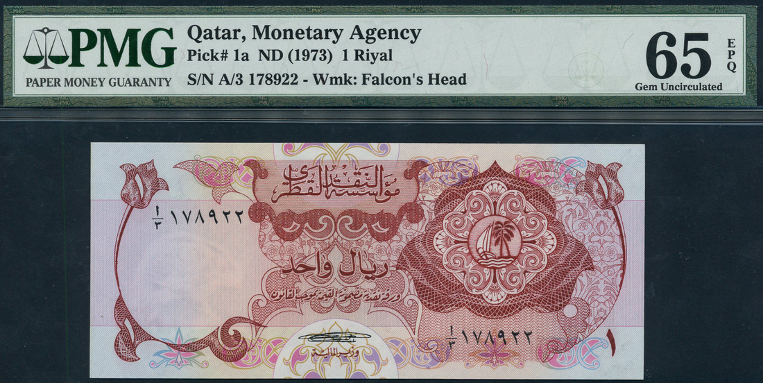 Qatar Monetary Agency, 1 riyal, ND (1973), serial number A/3 178922, maroon, coat of arms with dhow and palm tree at centre left, value in each corner, reverse, Port of Doha