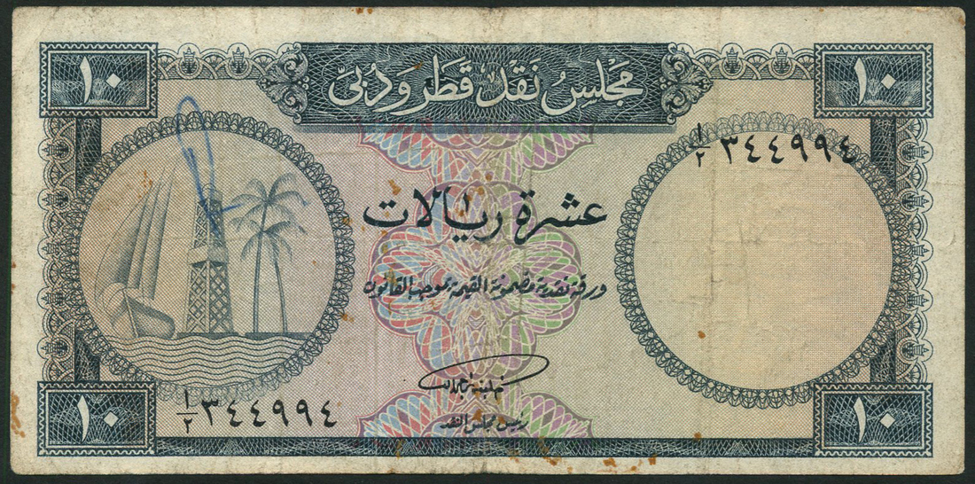 Qatar & Dubai Currency Board, 1 riyal, 5 riyals and 10 riyals ND (1960s), green, purple and grey-blue respectively, all feature dhow, derrick