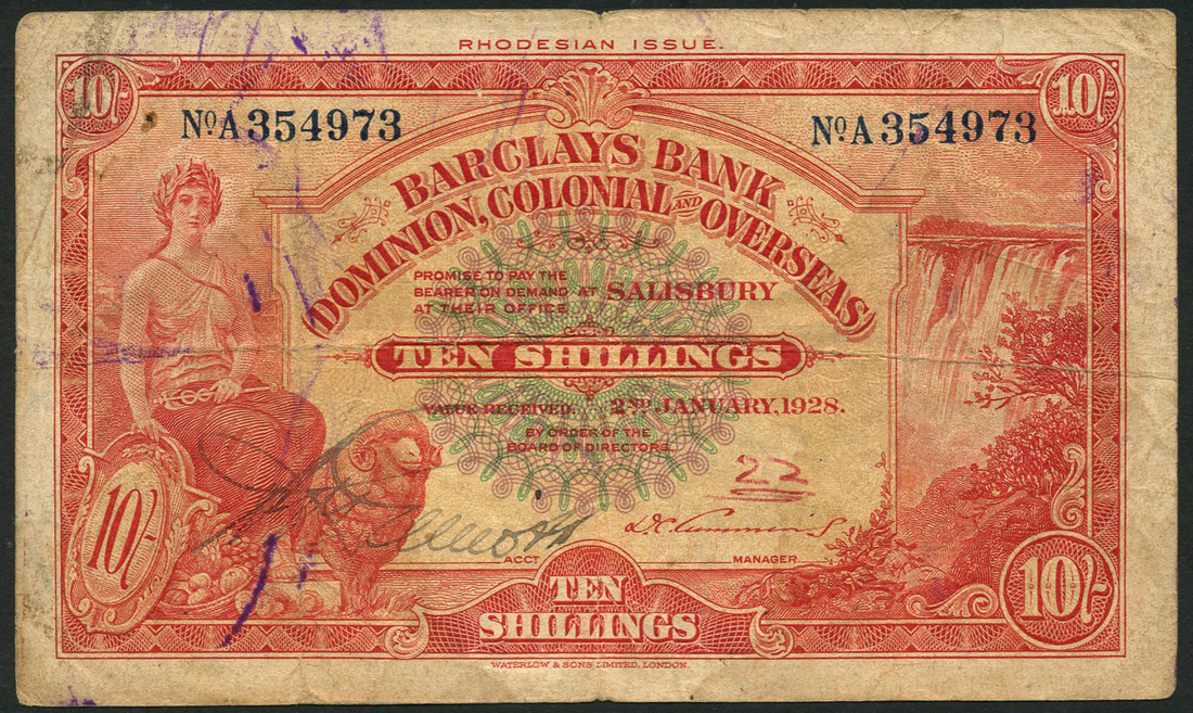 Barclays Bank (Dominion, Colonial and Overseas), 10 shillings, Salisbury, 2 January 1928, blue serial number A 354973, red, pale yellow and green, seated maiden at left with arms, fruit and ram, Victoria Falls at right, ink signature low left, printed signature of D.C.Cummins at right, reverse red and pale yellow, reclining lion low centre, bank title at centre, value at each corner