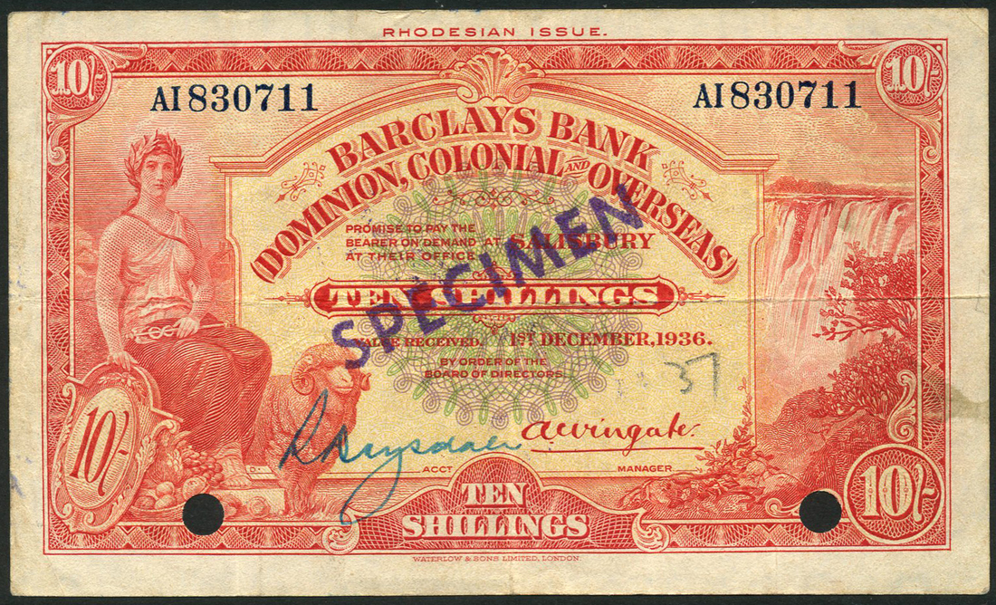 Barclays Bank (Dominion, Colonial and Overseas), 10 shillings, Salisbury, 1 December 1936, blue serial number AI 830711, red, pale yellow and green, seated maiden at left with arms, fruit and ram, Victoria Falls at right, ink signature low left, printed signature of A.Wingate at right, reverse red and pale yellow, reclining lion low centre, bank title at centre, value at each corner