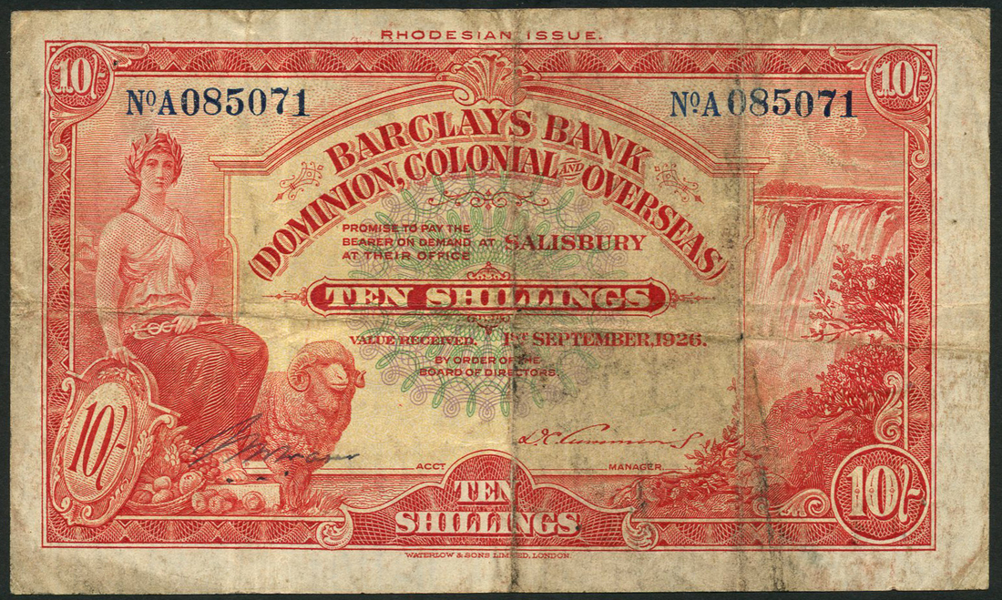 Barclays Bank (Dominion, Colonial and Overseas), 10 shillings, Salisbury, 1 September 1926, blue serial number A 085071, red, pale yellow and green, seated maiden at left with arms, fruit and ram, Victoria Falls at right, ink signature low left, printed signature of D.C.Cummins at right, reverse red and pale yellow, reclining lion low centre, bank title at centre, value at each corner