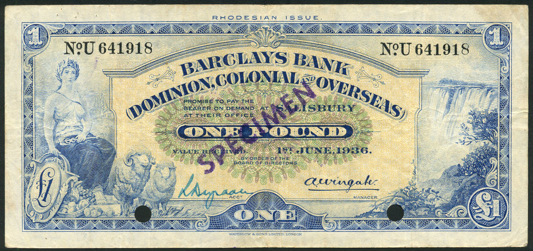 Barclays Bank (Dominion, Colonial and Overseas), £1, Salisbury, 1 June 1936, serial number U 641918, blue and pale yellow, lilac and green, seated maiden at left with arms, fruit and ram, Victoria Falls at right, ink signature low left, printed signature of A.Wingate at right, reverse blue and pale yellow, reclining lion low centre, bank title at centre, value at each corner