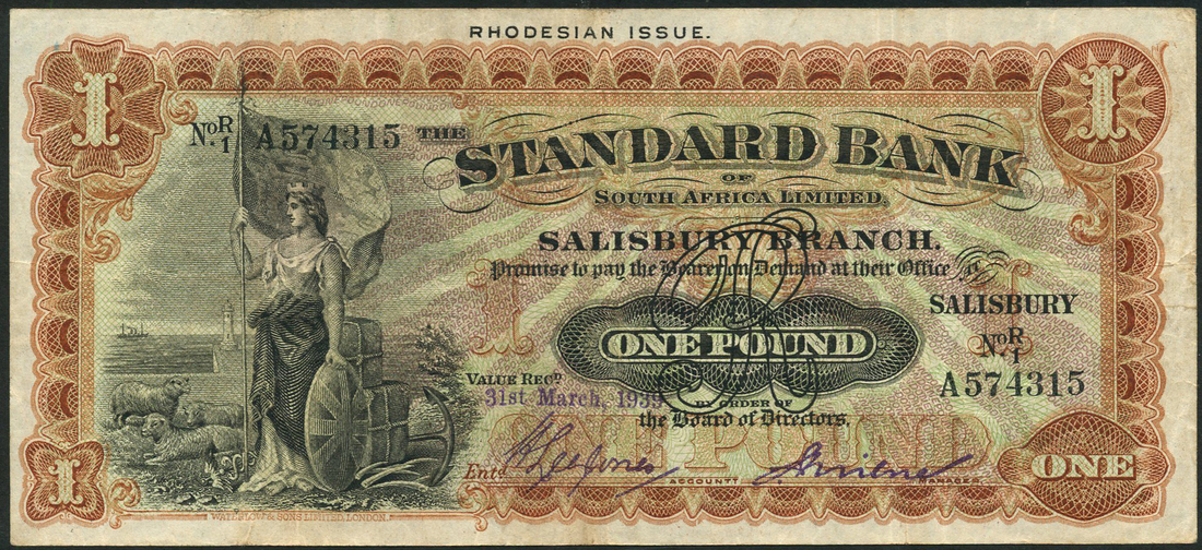 Standard Bank of South Africa Limited, £1, Salisbury, 31 March 1939, serial number R/1 A 574315, brown and pale blue, Britannia and Union flag at left with allegorical symbols of prosperity and commerce, two manuscript signatures below, reverse brown, turreted maiden at centre, value at left and right