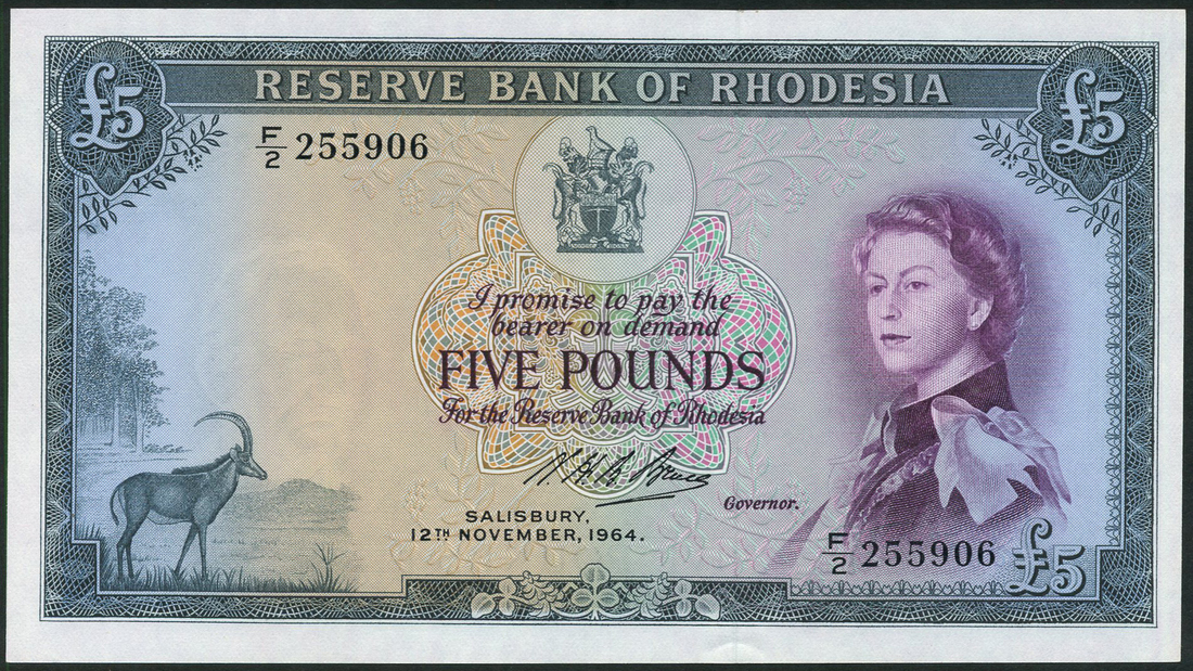 Reserve Bank of Rhodesia, £5, 12 November 1964, serial number F/2 255906, blue green on multicolour underprint, portrait Queen Elizabeth II at right, sable antelope at low left, bank title top centre with arms below, reverse, Zimbabwe ruins at centre, ornate border