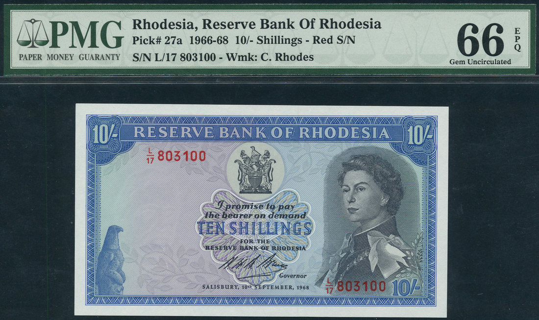 Reserve Bank of Rhodesia, 10 shillings, 10 September 1968, serial number L/17 803100, blue on light blue and lilac, portrait Queen Elizabeth II at right, bank title top centre with arms below, reverse, tobacco field