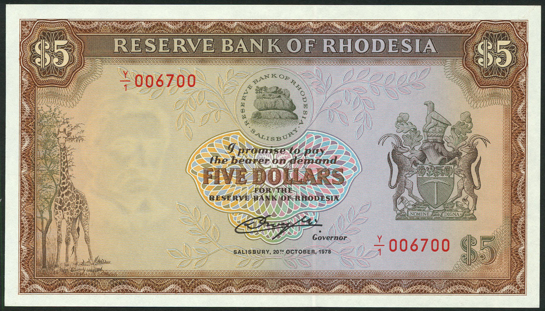Reserve Bank of Rhodesia, a group of replacement notes comprising, $1 (3), 18 April 1978, prefix W/1, $2 (3), 10 April 1979, prefix X/1, $5, 20 October 1978, prefix Y/1, and $10, 2 January 1979, prefix Z/1 (two of the notes are consecutive), blue, red, brown and blue-green respectively