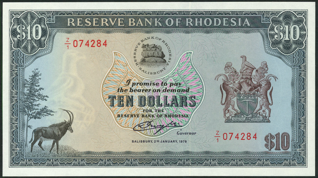 Reserve Bank of Rhodesia, $2 (2), 10 January 1979, prefixes K/86 and K/176, red, $5 (2), 15 May 1979, prefix M/22, brown, $10, 2 January 1979, prefix Z/1, blue-grey, all with arms at right