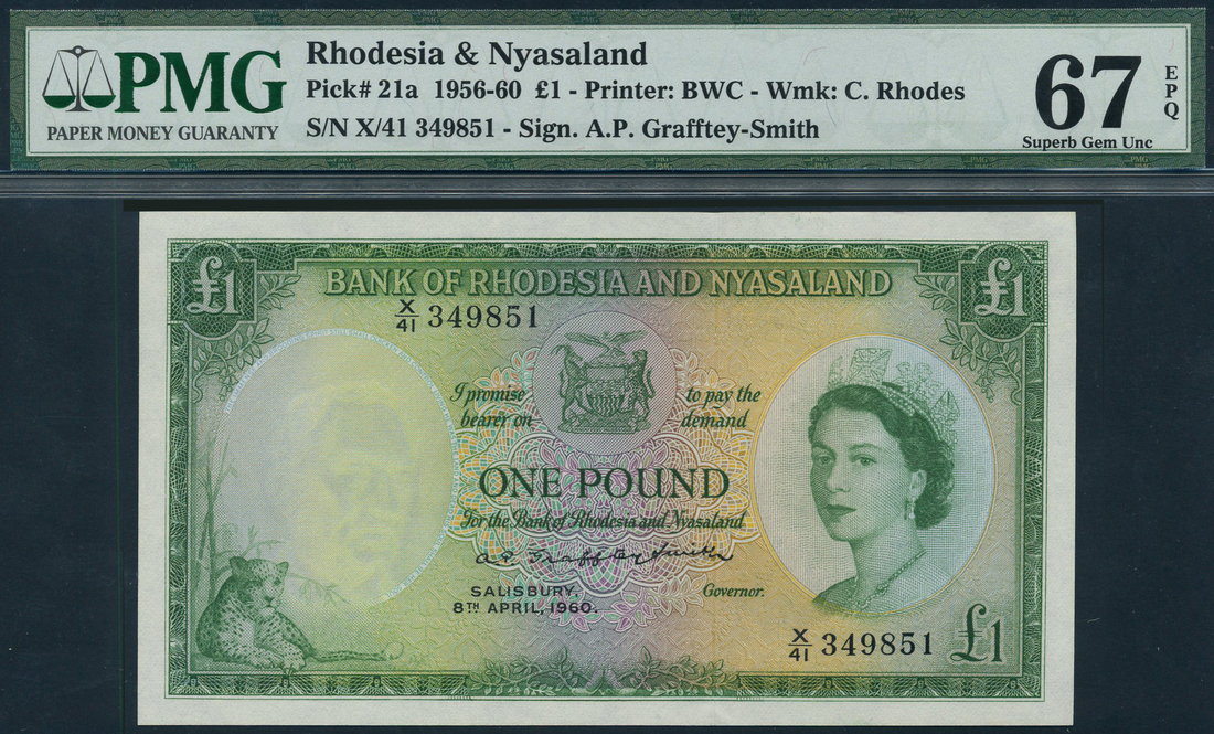Bank of Rhodesia and Nyasaland, £1, 8 April 1960, serial number X/41 349851, green on pale green, lilac and yellow, portrait Queen Elizabeth II at right, leopard low left, bank title top centre with arms below, reverse, Great Zimbabwe ruins