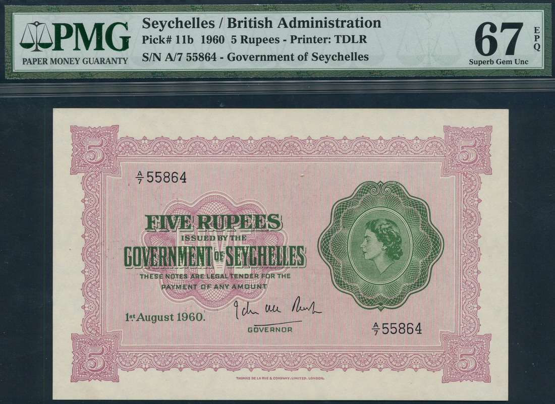 Government of Seychelles, 5 rupees, 1 August 1960, serial number A/7 55864, olive green and lilac, portrait Queen Elizabeth II in ornate frame at centre right, value in each corner and in guilloche pattern at centre left, reverse, palm trees and tortoise in circular frame flanked by value