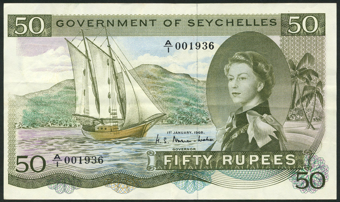 Government of Seychelles, 50 rupees, 1 January 1968, serial number A/1 0001936, olive green, portrait Queen Elizabeth II at right, boat in full sale at centre, palm trees far right, reverse, guilloche patterns, also 5 rupees, 1 January 1968, serial number A/1 374151, pink and grey, portrait Queen Elizabeth II at right, Seychelles black parrot at left