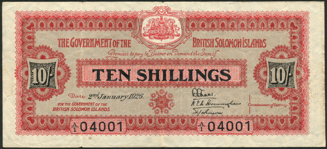 Government of the British Solomon Islands, 10 shillings, 2 January 1926, serial number A/1 04001, red and pale grey, arms top centre, value at centre and at left and right, three printed signatures of Kane, de Heveningham and Johnson low right
