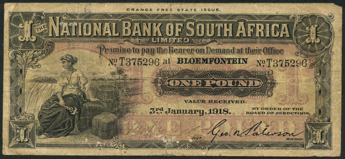National Bank of South Africa, Orange Free State issue, £1, Bloemfontein, 3 January 1918, serial number T375296, black on brown and green underprint, seated maiden and waterfall at left, reverse blue, map of Africa at centre