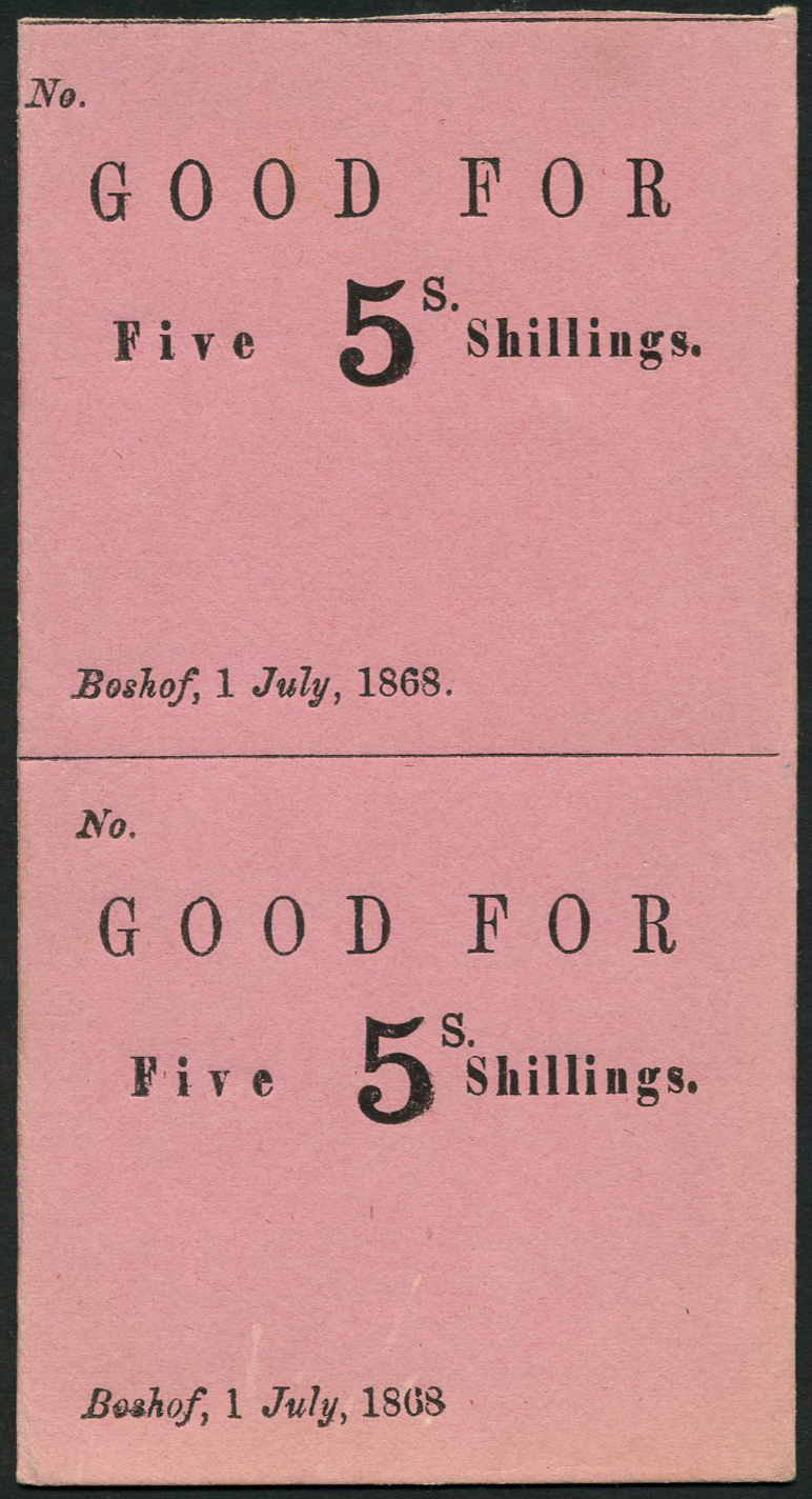 Bloemfontein Bank, Orange Free State, sheet of two unissued 'Good For' for 5 shillings, 1 July 1868, black on pink card, value at centre