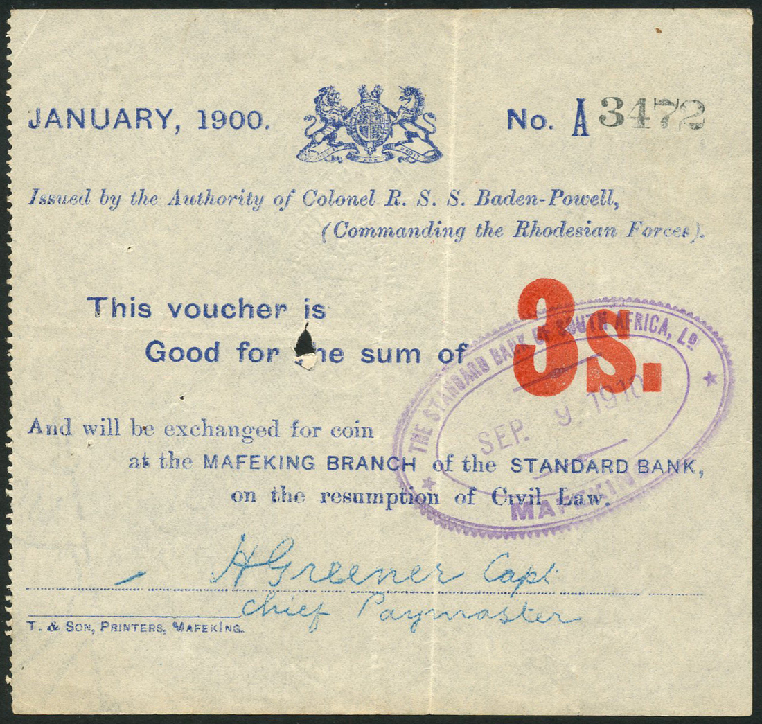 Siege of Mafeking, 3 shillings, January 1900, serial number A 3472, blue text on white paper, arms top centre, value in red at right, embossed seal of the Bechuanaland Protectorate at centre, facsimile signature in blue of Capt.H.Greener, the Chief paymaster, low right