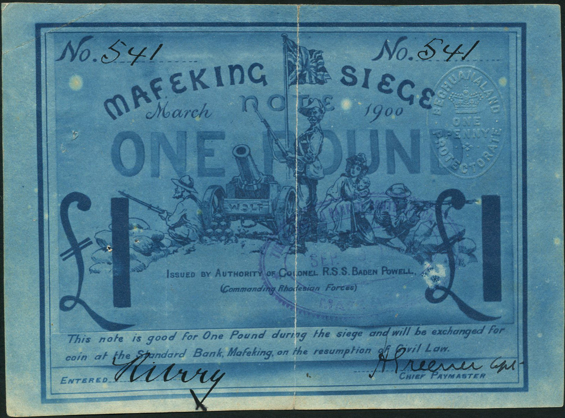 Siege of Mafeking, £1, March 1900, manuscript serial number 514, dark blue text on blue cardlike paper, arms top centre, value at centre and top left and right, soldiers, woman and child and howitzer 'Wolf' at centre, seal of the Bechuanaland Protectorate top right, manuscript signatures of Mr R.Urry, the Manager of the local branch of the Standard Bank low left, Capt.H.Greener, the Chief paymaster, low right