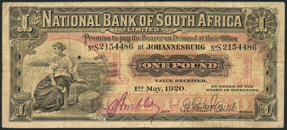 National Bank of South Africa, Transvaal, £1, Johannesburg, 1 May 1920, serial number S2154486, black on brown and green underprint, seated maiden and waterfall at left, reverse blue, map of Africa at centre