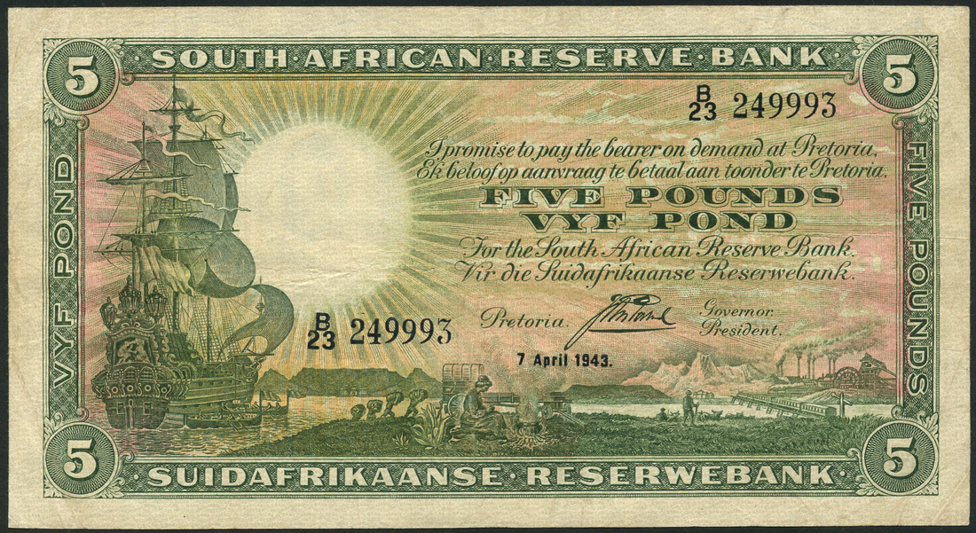 South African Reserve Bank, £1 (2), 29 January 1958, consecutive serial numbers B317 238902/3, £1 (6), all 1 November 1955, three sets of consecutive serial numbers, £1, 13 October 1954, serial number B184 153526, £10, 18 December 1952 (2), serial numbers D/1 589301, D/1 781763, £5, 7 April 1943, serial number B/23 249993, green,