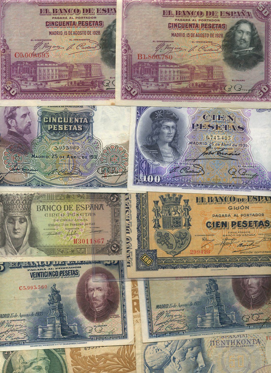 Banco de Espana, Gijon, Civil War issue, 100 pesetas, September 1937, serial number 299423, dark grey on orange underprint, arms at left, ornate border, value low left and right and at centre, reverse, agricultural scene, together with 25 pesetas (2) 1928, 50 pesetas (2), 1928, 50 pesetas, 1931, 100 pesetas, 1931 and 5 pesetas, 1943, together with Bank of Greece, 1000 drachmai, 1 May 1935, serial number AI = 017, pastel colours, woman in national costume at centre flanked by olive trees, value top left and right, reverse, ornate columns at left and right, representations of boatbuilding and steelworks at low left and right respectively (in CGA holder number 58*, about uncirculated, original paper quality), together with a number of notes from Hungary, Germany, Turkey, Turkmenistan, Denmark, Cyprus, Romania, Russia, Iceland, Sweden, Yugoslavia, Belgium, Austria, Serbia, Norway, Spain, Morocco, Israel, Italy