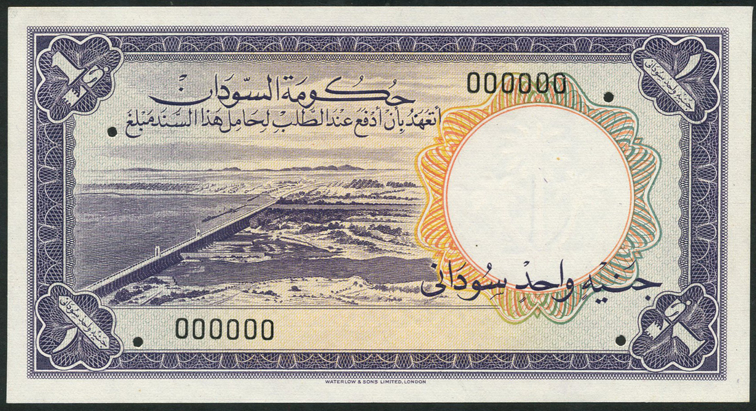 (x) Sudan Government, colour trial £1, ND (1955), zero serial number, purple on multicolour, Sennar dam on Blue Nile, reverse purple, camel, four small hole punches