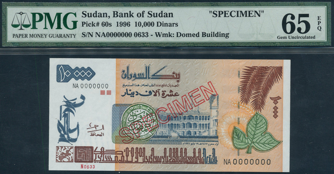 (x) Bank of Sudan, specimen 10,000 dinars, 1996, serial number NA 0000000, orange, brown and blue, palace building in background, reverse coat of arms at left, building at right, red hollow SPECIMEN overprint