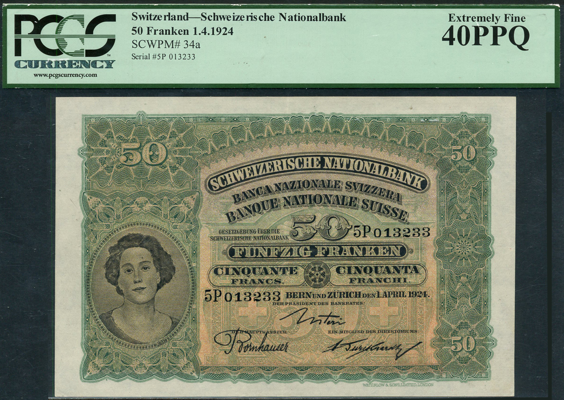 (x) Schweizerische Nationalbank, 50 franken, 1 April 1924, serial number 5P 013233, black on green, portrait of women at right, reverse green, F Holder's woodcutter
