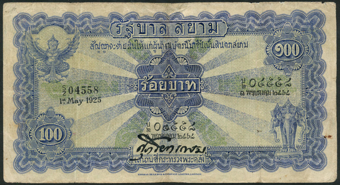 (x) Government of Siam, 100 baht, 1 May 1925, serial number S/2 04558, blue on green underprint, Garuda at top left, reverse blue and green, ceremonial procession at centre