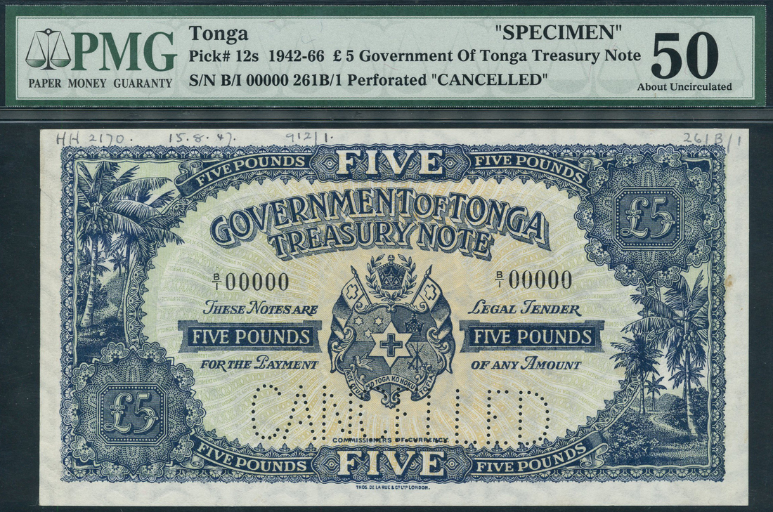 (x) Government of Tonga, specimen £5, ND (ca 1947), serial number B/1 00000, blue, arms at centre