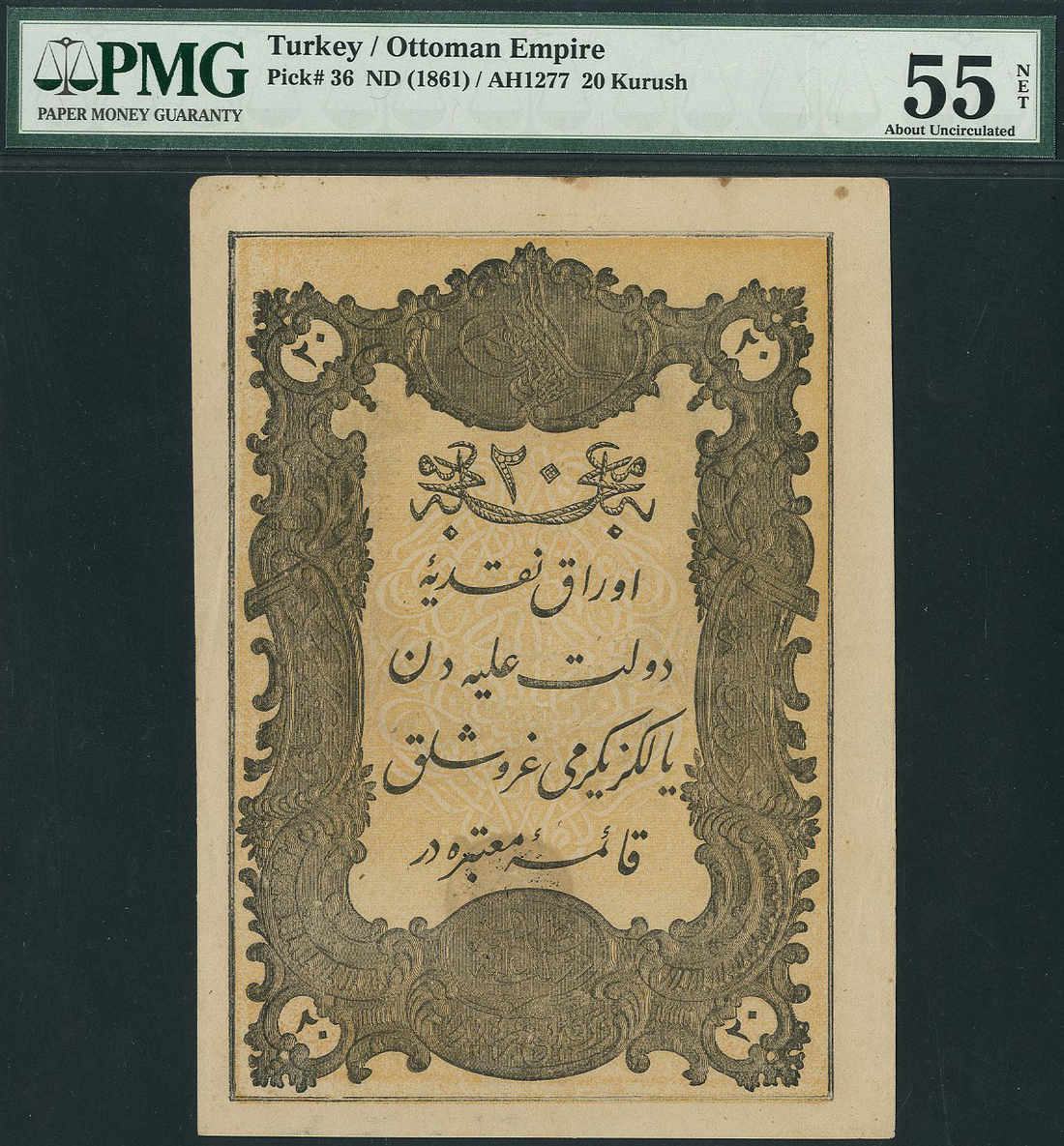 (x) Ottoman Empire, 20 kurush, AH 1277 (1861), brown and yellow, toughra top centre, also 50 kurush, AH 1277 (1861), brown and pale pink-orange, toughra top centre, both five lines of text on reverse, handstamped seal low centre