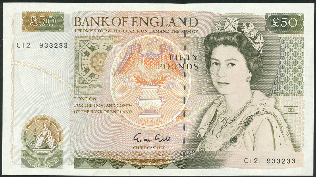 Bank of England, G M Gill, £50, 21 July 1988, serial number C12 933233, D93 952923 and E30 940980, olive green and multicolour, portrait Queen Elizabeth II at right, seated Britannia low left, phoenix rising from flames at centre, reverse, Christopher Wren
