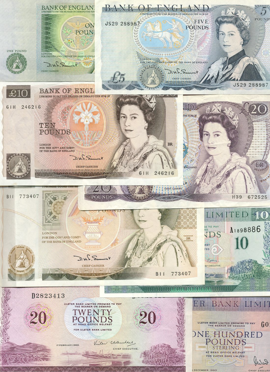 British Isles, a group comprising Bank of England, D.H.F Somerset, £1, £5, 1980, prefix JS29, £10 (3), prefixes 61H, CW70, CX20, 1980-4, £20, 1981, prefix H39, £50, 1981, prefix (2), Page £1, 1970, 1978(2), Ulster bank ltd, £10, 1997, serial number A1898886, £20, 1988, £100, 1990, Central Bank of Ireland £1, 1989, £5, 1981, £10, 1988, Royal Bank of Scotland Ltd, £10, 1981, Royal Bank of Scotland plc, £10, 1989